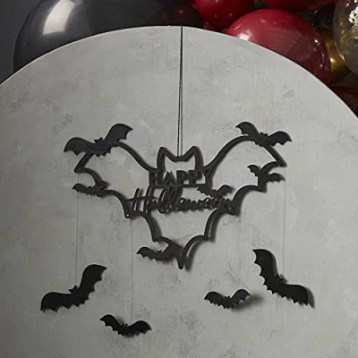This 'Happy Halloween' wreath is the perfect spooky sign to hang on your front door for all the trick or treaters to see. Each pack contains 1 x black wooden Halloween door wreath measuring 40 cm in width complete with 4 x hanging wooden bats in 2 sizes. Part of the Ginger Ray Fright Night Range, Manufacturer: Ginger Ray