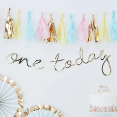 A gorgeous gold foiled 'One Today' backdrop. As part of our Pick & Mix range you can mix and match this beautiful party backdrop with any of our pick & Mix products. It's the perfect backdrop for your precious little one. Hang from walls and doorways for an impressive decoration. Mix with the rest of our range from Pick & Mix. Gorgeous! Each pack includes one backdrop measuring 1.5m (L) and 25cm (H). Part of Ginger Rays Pick and Mix Range., Manufacturer: Ginger Ray