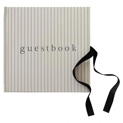 Elegant off-white guestbook with grey stripes and 'guestbook' text Linen cover with black velvet ribbons for closure 'Mr & Mrs' embossed on the spine, ideal for weddings Measures 21.5cm H x 21.5cm W with 3mm thickness A timeless keepsake for your wedding day memories