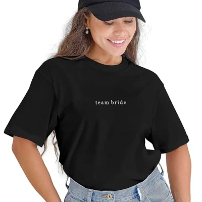Gather your bride squad with the black 'Team Bride' hen party t-shirts. Each black T-shirt has white embroidered 'Team Bride' writing on the front. Size: Small (UK Size 8-10), Manufacturer: Ginger Ray