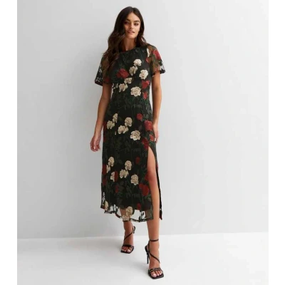A Black Angel Sleeves Embroidered Occasion Midi Dress can be your classic statement with a floral print all over, a crew neckline, flowy sheer sleeves and a side slit in a shift silhouette. This piece is ideal for any gathering or special occasion, like weddings or even evening parties.