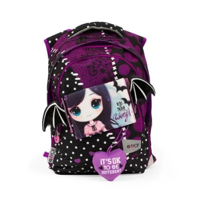 The Dark Love backpack is ideal for all little girls who love the dark world and who do not give up a unique style! Expandable backpack with zip to increase load capacity (+9 cm), round shape 4 compartments and inner pockets for snacks and accessories. Padded back and padded "FIT-TO-WEAR" shoulder straps that fit perfectly to the back Removable custom headband blends with backpack body patterns and brings out stories and characters. Discover themed pop up inside the pockets.