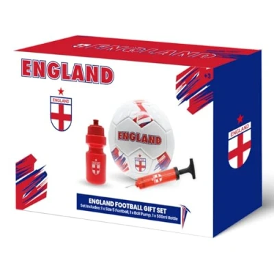 COMPLETE 3 PIECE SET: Each box includes a size 5 football, a colour matched 500ml water bottle, and a handy hand pump to keep your ball ready for action, the perfect all-in-one gift for birthdays, Christmas, or match #day excitement. QUALITY BUILD & DESIGN: Durable synthetic rubber ball construction ensures lasting performance, while the water bottle and pump feature the same bold national colours and logos to create an authentic football experience. PERFECT FAN GIFT IDEA: Designed for football lovers young and old, this stylish country themed set is ideal for supporters, collectors, or families looking for a unique gift to celebrate their favourite team and national pride. SHOW YOUR NATIONAL PRIDE: Celebrate your country’s spirit with this themed football gift set available as England, Ireland, and Scotland designs, perfect for home, park, or garden play and a must-have for every passionate football fan. OFFICIAL SIZE & IDEAL PACKAGING: Each set comes in a full-colour display box, making it a standout football gift. The size 5 ball offers real match feel for recreational play, while the packaging is perfect for gifting and easy storage.