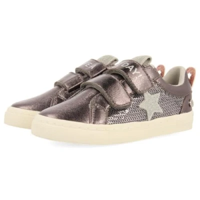 Lead color sneakers with sequins, glitter and adjustable closures Gio Memory Effect footbed to soften and cushion the gait Lining and insole are 100% breathable and recycled polyester The spinning of the lining fabrics have Global Recycle Standard (GRS) certified guarantee seal