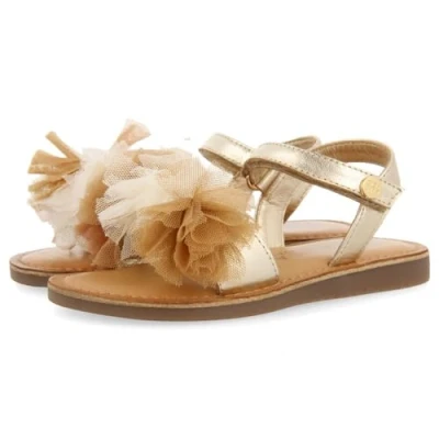 Golden leather sandals with tulle fabric embellishments in nude tones Leather lining The insole is padded Sustainably tanned leather footbed