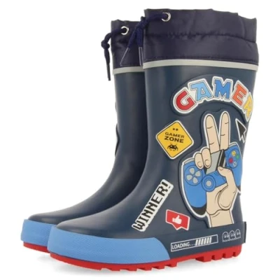 Navy wellies with gamer patches Incorporate adjustable nylon collar and 100% polyester padded lining and insole The sole is made of natural rubber and is durable, waterproof and non-slip Water Resistant