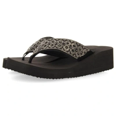 Black flip flops with 4 cm wedge and black crystals embellishment on the straps 100% Polyester Cut Soft plant Flexible floor
