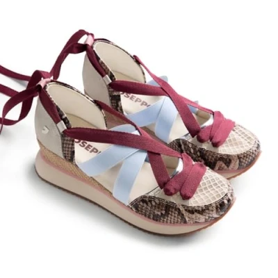 LEATHER OPEN SNEAKERS | Sandals with an elegant snake print, combined with metallic accents and color accents, bringing a unique and modern style for your warmer days 5.5CM PLATFORM AND WEDGE | With a 2.25" wedge, these sandals offer elevated and comfortable support, excellent for all-day walking, keeping the balance between comfort and style ELASTIC & ADJUSTABLE TIES | Features elastic instep and adjustable ties for a custom, secure fit, ensuring comfort and stability when walking TPR MATERIALS AND SOLE | Leather upper, breathable polyester and PU with a flexible TPR sole that allows for a natural step. Its recycled polyester lining and plant meet Global Recycled Standard Certification SPANISH DESIGN | Gioseppo presents a footwear proposal created in Spain, noting for its careful design and materials designed for any occasion.