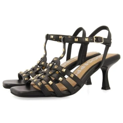 Crab style leather sandals featuring a thin heel and square toe with studded embellishments Heel height 6.5 cm Cushioned footbed provides comfort Leather lining
