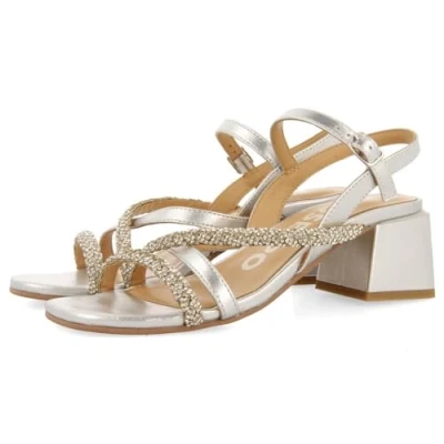 Silver heeled sandals with strappy and rhinestone details Flexible floor Adjustable ankle closure Leather lining