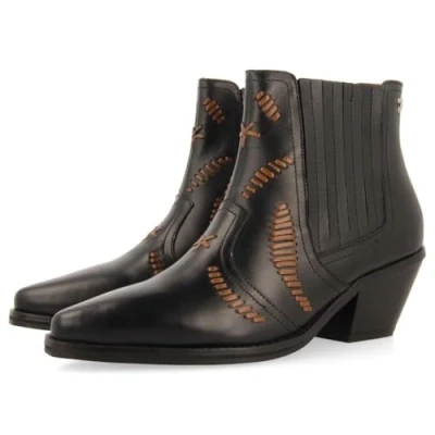 Black cowboy style leather ankle boots with leather embroidery They have a very padded footbed, rubber floor and natural fibre plant Lining, cutout and insole are made of standing Sustainable Elegance