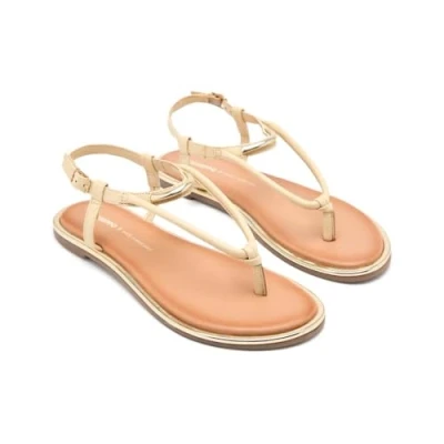 Greek style flat sandals with metallic embellishment detail and metallic rim with buckle closure