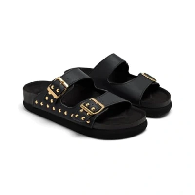 Studded Buckle Sandals Features anatomical microfiber footbed