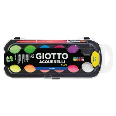 GIOTTO Aquarelli 12 Fluo Watercolour Pans, Includes 1 Brush, Assorted Colours, Ideal for Children, Party Bags & Schools