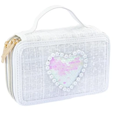 GIRABRILLA TWEED PENCIL PENCIL CASE: White three-tier pencil case made of soft fabric, with handle and reversible sequin decorations that change color, suitable for children and made of quality materials. Features: The 3-compartment pencil case is closed with convenient and practical zip and is covered with woven fabric and beads. The materials from which the pencil case was made are tested and safe, comply with European regulations and are water resistant. Contents: 16 markers, 16 coloured pencils, 1 drawing and colouring notebook, 2 pens, 1 ruler, 1 eraser, 1 sharpener. DIMENSIONS: 20.5cm x 14.5cm x 7.5cm Original Girabrilla product by Nice Group. Recommended age: 6+