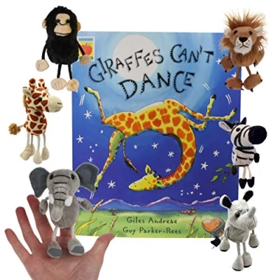 In this book by Giles Andreae & Guy Parker-Rees all children will identify with poor Gerald the Giraffe’s dilemma! He wants to dance but can’t & the other animals make fun of him. Includes Giraffe, Rhino, Chimp, Lion, Zebra & Elephant finger puppets. Includes a zip-top red velour storage bag with a clear window at the front and printed postcard to illustrate the book and contents of the set. The contents of this set comprise a children’s storybook along with a selection of finger puppets. These puppets are not intended to be identical to the pictures in the book, but are merely representative of the characters involved., Manufacturer: The Puppet Company