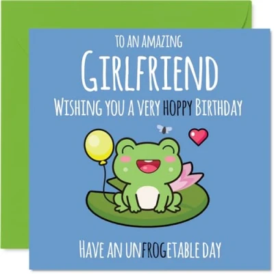 MAKE YOUR GIRLFRIEND SMILE WITH THIS UNIQUE BIRTHDAY CARD: This exceptional quality Girlfriend birthday card shows the design 'To an amazing Girlfriend Wishing you a very hoppy birthday. Have an unfrogetable day'. If you are looking for a beautiful birthday card Girlfriend, then then this happy birthday Girlfriend card is bound to make them smile. Not just a birthday card for Girlfriend this could also be a birthday gifts for Girlfriend, Partner or Companion. WHAT DO YOU GET: The card is printed on one side and BLANK ON THE INSIDE to allow you to write your very own message. The unique fun design is printed on a specially sourced and environmentally responsible board. At 360 microns thick the natural white one-sided gloss board has a quality look and feel. Supplied with a coloured gummed envelope to complement the design and ready to be sealed and sent in the post. Girlfriend Anniversary cards, Partner birthday cards, Companion birthday card. NO INK SMUDGES: There is nothing worse than writing inside a card to find that the shiny surface makes the ink smudge. This is why we use a high quality one sided coated board. The uncoated side will absorb more of the ink from your pen to make smudging a thing of the past. Girlfriend birthday cards, Girlfriend birthday cards from Boyfriend. SIZES: Greeting Card = 145mm x 145mm, Envelope = 155mm x 155mm, Card Thickness = 360 micron. Happy birthday Girlfriend, Girlfriends birthday card, Girlfriend cards birthday, birthday card Girlfriend, happy birthday Girlfriend card, Girlfriend gifts from Boyfriend. MADE AND QUALITY CHECKED IN THE UK: We print and manufacture all our products right here in the UK so you can be sure of a fast turnaround and a product that is expertly made. Using environmentally responsible premium board our card is conscious of the responsible management of the world's forests - happy birthday card Girlfriend, Girlfriend birthday cards.