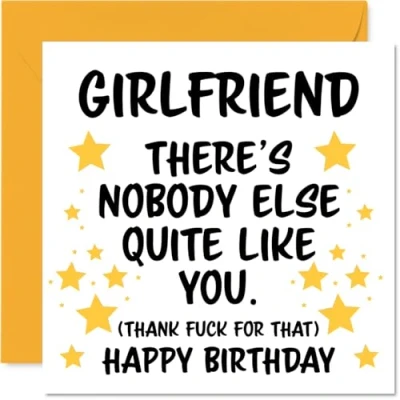 MAKE YOUR GIRLFRIEND SMILE WITH THIS UNIQUE BIRTHDAY CARD: This exceptional quality Girlfriend birthday card shows the design 'Girlfriend Theres nobody else quite like you. (Thank fuck for that) Happy Birthday'. If you are looking for an awesome birthday card for Girlfriend, then then this happy birthday Girlfriend card is bound to make them smile. Not just a birthday card for Girlfriend this could also be a birthday gifts for Girlfriend, Partner or Companion. WHAT DO YOU GET: The card is printed on one side and BLANK ON THE INSIDE to allow you to write your very own message. The unique fun design is printed on a specially sourced and environmentally responsible board. At 360 microns thick the natural white one-sided gloss board has a quality look and feel. Supplied with a coloured gummed envelope to complement the design and ready to be sealed and sent in the post. Great Girlfriend birthday cards, Partner birthday card. NO INK SMUDGES: There is nothing worse than writing inside a card to find that the shiny surface makes the ink smudge. This is why we use a high quality one sided coated board. The uncoated side will absorb more of the ink from your pen to make smudging a thing of the past. Girlfriend birthday cards, Girlfriend birthday cards from Boyfriend. SIZES: Greeting Card = 145mm x 145mm, Envelope = 155mm x 155mm, Card Thickness = 360 micron. Happy birthday Girlfriend, Girlfriends birthday card, Girlfriend cards birthday, birthday card Girlfriend, happy birthday Girlfriend card, Girlfriend gifts from Boyfriend. MADE AND QUALITY CHECKED IN THE UK: We print and manufacture all our products right here in the UK so you can be sure of a fast turnaround and a product that is expertly made. Using environmentally responsible premium board our card is conscious of the responsible management of the world's forests - happy birthday card Girlfriend, Girlfriend birthday cards.
