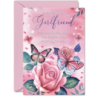 Girlfriend Birthday Card Pink Rose Butterfly Beautiful Happy for from Partner Boyfriend, A5 Female Floral Bday Greeting Cards