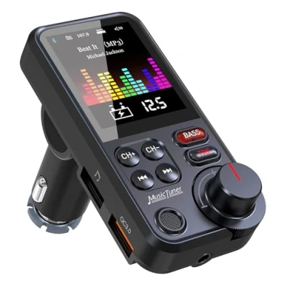 【𝙇𝙖𝙧𝙜𝙚 𝟭.𝟴-𝙞𝙣𝙘𝙝 𝘾𝙤𝙡𝙤𝙧 𝘿𝙞𝙨𝙥𝙡𝙖𝙮】- Boasting a 1.8-inch color screen with large, easy-to-read fonts, adjustable neck, and 170° viewing angle, this Bluetooth Car Adapter is a driver's best friend. Features include moderate screen brightness, car voltage monitoring, smart language assistance, and navigation support. 【𝘾𝙧𝙮𝙨𝙩𝙖𝙡-𝘾𝙡𝙚𝙖𝙧 𝙎𝙤𝙪𝙣𝙙 𝙌𝙪𝙖𝙡𝙞𝙩𝙮】- Our Bluetooth FM Transmitter features BASS and TRE modes, advanced stereo frequency modulation, and DSP technology, ensuring a noise-free, clear, and loud audio experience. Plus, enjoy precise volume control at your fingertips. 【𝙎𝙚𝙖𝙢𝙡𝙚𝙨𝙨 𝙃𝙖𝙣𝙙𝙨-𝙁𝙧𝙚𝙚 𝘾𝙖𝙡𝙡𝙨】- Upgraded Bluetooth technology provides stable connections for interference-free calls. Compatible with all smartphones, it offers easy one-touch answering and automatic reconnection, making your drive safer and more convenient. 【𝙈𝙪𝙡𝙩𝙞𝙥𝙡𝙚 𝙈𝙪𝙨𝙞𝙘 𝙋𝙡𝙖𝙮𝙞𝙣𝙜 𝙈𝙤𝙙𝙚𝙨】- A versatile 4-in-1 music player, supporting USB, Bluetooth, TF card, and AUX inputs. Compatible with MP3, WMA, WAV, FLAC formats, it includes a power-off memory feature for USB and TF cards and ensures stable, clear sound via AUX. Suitable for all car types. 【𝙀𝙛𝙛𝙞𝙘𝙞𝙚𝙣𝙩 𝙌𝘾 𝘾𝙝𝙖𝙧𝙜𝙞𝙣𝙜】- Equipped with two USB ports, including a QC fast-charging port, our device boosts charging efficiency by 80%. Comprehensive protection against over-voltage, over-current, short-circuit, and overheating ensures safe charging while you enjoy high-definition music.