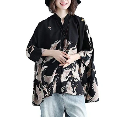 GK O Women Japanese Style Crane Print Long Sleeve Chiffon Shirt Loose Fit Blouse, Black, L