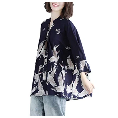 GK O Women Japanese Style Crane Print Long Sleeve Chiffon Shirt Loose Fit Blouse Blue Large