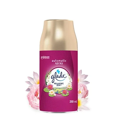 Enjoy up to 2 months of fragrance with Glade automatic spray air freshener Discover Glade automatic refills which have fragrance crafted by master perfumers and infused with essential oils made without phthalates parabens formaldehydes Compatible with Air Wick Freshmatic devices Switch things up with some flower power and boost the fragrance of any room with Glade battery operated air freshener Relaxing Zen with notes of lotus flower muguet and lily pads Feel the perfect harmony with a fresh burst of air freshener spray every 9 18 or 36 min for a timed fragrance release When used with the 36-minute interval Air Wick and Freshmatic are registered trademarks of Reckitt Benckiser LLC Neither this product nor S C Johnson & Son Inc are affiliated with or sponsored by Reckitt Benckiser LLC