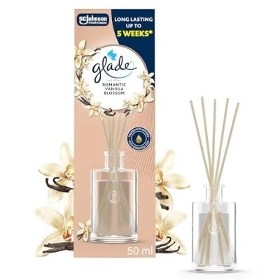 LONG LASTING REED DIFFUSER - Glade Reeds Diffuser sticks envelop your home with a continuous romantic fragrance for up to 5 weeks. ROMANTIC FRAGRANCE - Set the mood with the soft, floral warmth of Romantic Vanilla Blossom - a gentle, inviting scent that adds a touch of elegance to your space. SUITABLE FOR ANY ROOM - Diffused with fragrance through 5 reeds, this diffuser is ideal for any sized room in your home where you want to create a romantic and welcoming atmosphere, from your living room to your bathroom. ESSENTIAL OILS - This aromatic room diffuser is infused with essential oils sourced from their countries of origin. It contains no parabens, phthalates, nitro musks, artificial colours or dyes. FRAGRANCES - Find your perfect fragrance escape with Glade Reed Diffusers. Choose from Romantic Vanilla Blossom, Sensual Sandalwood & Jasmine, Relaxing Zen, and Clean Linen to elevate your space.
