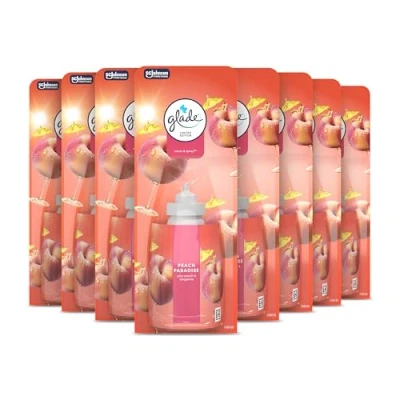 You move it sprays, for fragrance only when you need it Enjoy up to 2 months of Glade fragrance* Peach Paradise with notes of juicy lychee, nectarine and satin musk Fragrance crafted by master perfumers and infused with essential oils and made without phthalates, parabens, formaldehydes *Assuming an average of 6 times per day