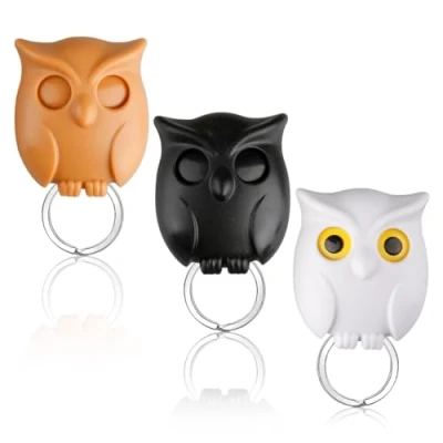 GLADFRESIT 3Pcs Cute Owl Key Holder, No Punch Hooks with Auto Open Close Eye for Hanging Decor Home Office Wall(Black&White&Curry)