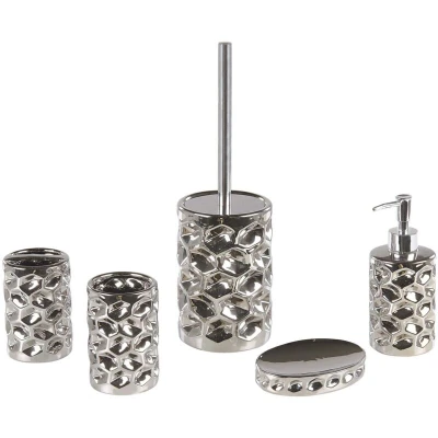 AmazonBathroom accessories set in silver Glam design with mirrored gloss finish Durable ceramic ensures longevity Set consists of toothbrush holder, tumbler, soap dispenser, soap dish and toilet brush Ready to use out of the box