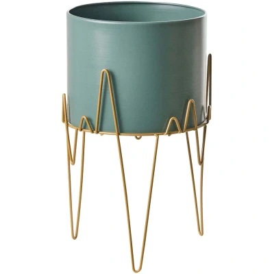 Decorative Standing Planter. This plant stand will make your potted flowers a stunning decoration for any room. Made of iron and featuring the golden base with the matching green pot, the piece is durable and easy to maintain. With its timeless yet eye-catching design, the plant stand fits well in both traditional and modern interiors, and is a perfect accent piece for your balcony or patio. Details: Product Type: Outdoor Plant Pot Style: Glam General Color: Green, Gold Shade: Dark Green Material Type: Metal Main Material: Iron Shape: Round Drainage Holes: No Finish: Powder Coated Insert Required: Yes Capacity: 14 Dimensions: Depth: 29 cm Width: 29 cm Height: 50 cm Weight: 2 kg Offer Includes: 1 x Elevated Plant Pot Key Features: Chic Look, Decorative Yet Functional, Both for Indoor and Outdoor Use, Easy Care and Durable Materials, UV Resistance, Lightweight and Easy to Move Around Assembly Information: Does Not Require Assembly Additional Information: Please note that each model may
