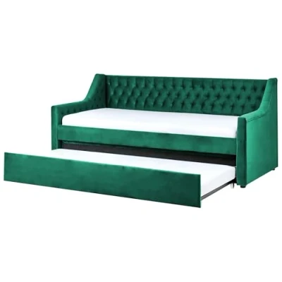 General description Velvet Daybed with a Trundle. Whether in a retro, glam, or traditional setting, this trundle bed makes a splendid addition to any room. Its solid, durable frame is tailored in soft-to-touch velvet, granting it a high-end, elegant look. The low armrests and tufted backrest highlight the classic design of the piece. Equipped with two slatted bases, the bed ensures healthy and undisturbed sleep. Technical specifications Product Type: Daybed Style: Glam General Color: Green Shade: Emerald Green Main Material: Velvet Material Composition: 100% Polyester Dimensions: Width: 91/189 cm, Length: 219 cm, Height: 94 cm Sleeping Surface: 90 x 200 cm Weight: 60 kg Weight Capacity: 160 kg Number of Slats: 24 Installation Full assembly required Estimated assembly time: 20-40 minutes Usage Second hidden bed for use when needed Perfect for both a bedroom and a living room Classic design with decorative tufting Other information To close the drawer easily, the height of the lower