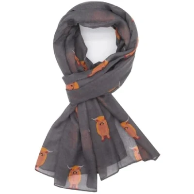 Highland Cow Print Scarf in grey Large Size Approx. 80 X 180 cms (31 X 70 inches) GlamLondon Soft Skin-friendly Washable Material Fashionable: This scarf can be used for different occasions, such as party, or family travel, or at work. Can be worn around your neck, waist, or hair as well as on a hat or handbag, etc Ideal gift for your lover, coworkers, family and friends. Individually wrapped in a clear poly bag