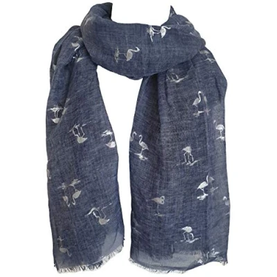 GlamLondon Women's Flamingo Print Scarf Silver Foil Birds Wrap (Blue Navy)
