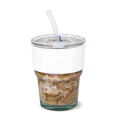 Glass Coffee Cup with Lid, Straw and Protective Sleeve, Clear Borosilicate Travel Mug for Hot Cold Drinks Iced Espresso, Latte, Cappuccino, Tea 350ml (Transparent Cup, White sleeve)