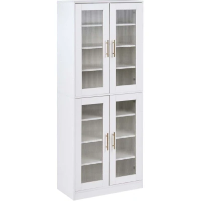 Tall Cabinet with Doors and Shelves. This modern white shoe storage cabinet, complete with an included LED strip, offers a stylish and practical way to organise your home. Designed with elegant ribbed glass doors, it subtly showcases your footwear while keeping clutter neatly concealed. Inside, its multiple spacious shelves provide ample room for shoes or hallway accessories. Versatile in design, it can also be used in living spaces, bedrooms, or kitchens to store books, décor, or household essentials. Details: Product Type: Shoe Storage Cabinet General Color: White LED Colour Temperature: Multicolour Material Type: Engineered Wood Main Material: Chipboard Additional Material: Tempered Glass Top Material: Engineered Wood Shelves number: 8 Doors Opening: Standard Drawers: No Finish: Melamine IP Protection Code: IP 65 LED Luminous flux: 120 LED Type: RGB LED: Yes Number of Doors: 4 Shelves: Yes Voltage rating: 12 V Capacity: Up to 24 Pairs of Shoes Dimensions: Depth: 35 cm Width: 70 cm