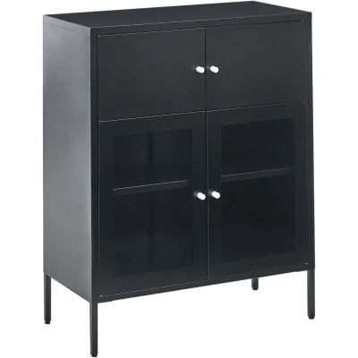 Glass Doors Cabinet. This versatile metal cabinet with a clean, contemporary design makes a perfect addition to a modern home. Its two upper doors conceal clutter, while the two lower glass doors provide an ideal space to display your favourite books and decor. The slim metal legs give it a lightweight feel, making it a perfect addition to any modern living or office space. Details: Product Type: Display Cabinet General Color: Black Material Type: Metal Main Material: Iron Additional Material: Glass Legs material: Metal Doors Opening: Standard Drawers: No Finish: Powder Coated Number of Doors: 4 Shelves: Yes Dimensions: Depth: 40 cm Width: 80 cm Height: 102 cm Weight: 24 kg Shelf Weight Capacity: 20 kg Top Weight Capacity: 30 kg Offer Includes: 1 x Display Cabinet Key Features: Minimalistic, Scandinavian Style, Perfect for Both a Bedroom and a Living Room, Robust Frame, Plenty of Storage Space, Leg Caps for Surface Protection Assembly Information: Full Assembly Required. 20-40 min.