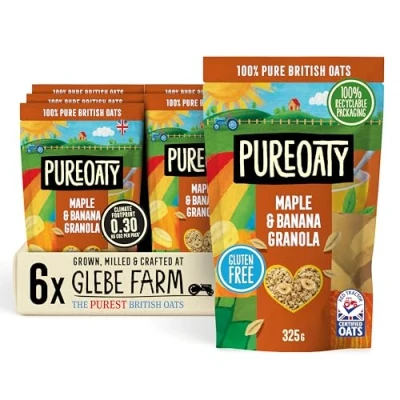 Glebe Farm Gluten Free PureOaty Maple & Banana Oat Granola 6PK, Healthy Wholegrain Oats To Help Lower Cholesterol, 100% British Oats, Vegan High In Fibre, Delicious Cereal, 6x 325g