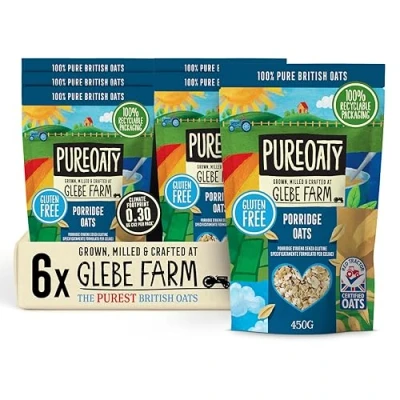 Glebe Farm Porridge Oats 6pk, Healthy Wholegrain Gluten Free For Slow Release Energy, 100% British, All Natural & High In Fibre, Delicious With No Hidden Nasties, 6x 450g