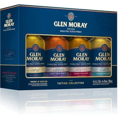 Glen Moray single malt tasting gift pack that explores the Elgin Classic Range. This set includes a miniature bottle of Glen Moray Classic, Glen Moray Port Cask Finish, Glen Moray Sherry Cask Finish and Glen Moray Peated. 4x5cl, 40% ABV, comes in a Gift Box Glen Moray single malt tasting gift pack that explores the Elgin Classic Range. This set includes a miniature bottle of Glen Moray Classic, Glen Moray Port Cask Finish, Glen Moray Sherry Cask Finish and Glen Moray Peated. 4x5cl, 40% ABV, comes in a Gift Box Glen Moray Classic: Traditional Speyside character as its very best. A wonderfully balanced and smooth whisky. Aged entirely in ex-bourbon casks to give a creamy vanilla and light oak character. Glen Moray Port Cask Finish: This light and fruity expression is finished for eight months in Port pipes from Porto Cruz. The spirit picks up intense embellishments of summer fruit, dark chocolate and cinnamon, along with a distinct pink hue. Glen Moray Sherry Cask Finish: This complex and full bodied expression is finished over several months in Oloroso Sherry casks sourced from Jerez in Spain. Vibrant dried fruits and earthy, nutty notes combine with traditional vanilla and light oak character to deliver a smooth and satisfying whisky. Glen Moray Peated: An intense but smoothly smoked expression. Smoked malted barley is used to infuse the spirit with a character reminiscent of charred wood on a bonfire. The traditional Speyside vanilla and oak flavours balance the smoke beautifully.