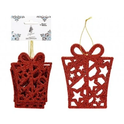 AmazonSet of 6 Tree Decorations Present Shape Full Glitter Comes with hanging strings Size: 10cm x 8cm Use to decorate your Christmas tree