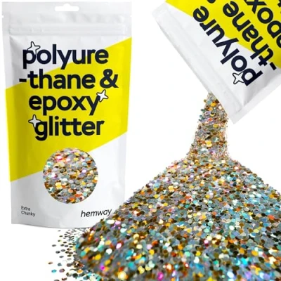 PREMIUM RESIN GLITTER: Our glitter adds a cool shimmer to epoxy & polyurethane resin projects; ideal for making candles, tumblers and resin accessories; use as a garage floor glitter, or mix with coatings as a glitter epoxy additive. EXTRA CHUNKY GLITTER: Whether you're crafting resin art, making jewellery, or adding sparkle to a coaster, our glitter adds extra sparkle to your resin creations; the flakes help to scatter light and remain suspended within the resin. DURABLE & LONG-LASTING: Its waterproof & fade, heat and solvent-resistant; the colourfast and super reflective properties help maintain brilliance over time; our resin glitter has 50 colours and 6 sizes to choose from. EASY TO MIX GLITTER: Specifically designed for use in polyurethane & epoxy resin; the high-quality flakes blend smoothly into resin projects, ensuring a consistent, sparkly finish; suitable for all skill levels. GOLD SILVER HOLOGRAPHIC GLITTER: Hemway epoxy glitter will add a bright and eye-catching effect to all your resin designs; ideal for a variety of arts & crafts. DISCLAIMER: Colours may vary in different lighting conditions.