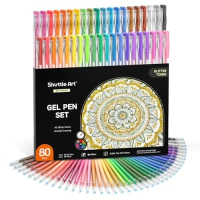 🎨 EXTENSIVE COLOUR SELECTION:Shuttle Art 80 pack gel pens for colouring offer 40 stunning individual shades—vibrant neon glitters and dazzling metallic sparkles! Perfect for adult colouring books, journaling, bullet writing, sketching, card making, and any creative project that calls for brilliance and fun. 💫 CAPTIVATING GLITTER EFFECT:Each pen is infused with high-quality shimmer particles that create a dazzling glitter trail with every stroke. Lose yourself in a sparkling universe of colour—ideal for adding magic to your @@@JgEhONrCFSM6Og7VNFLOb1hpFFEIqIfq@@@! 🏠 FUN FOR THE WHOLE FAMILY & THE PERFECT GIFT:Glitter pens for kids as well as adults, the ideal creative spark for artists of every age! Watch kids light up during craft time, help teens personalize their journals, and relax with your own adult colouring book. A wonderful gift that brings everyone together through the joy of creating. 🖋 SMOOTH & RELIABLE PERFORMANCE:Designed with 0.8 to 1.0mm nibs, these pens deliver buttery-smooth writing and vibrant colour laydown. They’re non-toxic, acid-free, and long-lasting—perfect for artists of all levels. ✅ SATISFACTION GUARANTEED:Your happiness is our promise. If you have any questions or concerns, our customer support team is always ready to assist.