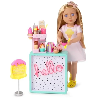 Serving Sweet Fun: Playtime’s a real treat with doll Lacy and her soft serve ice cream machine! Meet Lacy: Lacy has blue eyes, soft lashes, and soft blonde hair that’s fun to brush and style. 28-Piece Doll & Ice Cream Set: Set includes doll Lacy, a soft-serve ice cream machine, menu stand, ticket dispenser, and detailed play food items including ice cream cones, syrups, and sprinkles. Cool Setup: Create a cool pop-up shop by laying out the ticket dispenser, then stocking the soft-serve machine with syrup bottles, sprinkles, and cones! Changeable Clothes: Lacy’s adorable, 4-piece outfit features easy-open closures for seamless play., Manufacturer: Maison Battat Inc.