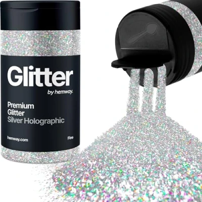 MULTI-PURPOSE CRAFT GLITTER: Our holographic glitter shaker adds a cool shimmer to any project, making it perfect for resin & epoxy glitter applications; ideal for autumn and Halloween glitter crafts, nail art, making cards, jewellery. DECORATIVE SUPPLIES: This skin-friendly glitter is ideal for silver face glitter paint, festival makeup or cosmetic decoration to your hair, body, nail glitter powder, face, or eyes & decorating Christmas glitter or Halloween decorations. VERSATILE USE: Perfect as glitter for resin, cards, paper, glitter for candle making and much more. Resin glitter, epoxy glitter, resin glitter for resin moulds. EASY & EFFECTIVE TO USE: The dual-opening circular lid provides precise control; apply the glitter while your adhesive is tacky; the high-quality particles adhere smoothly to different surfaces for a consistent, sparkly finish. PREMIUM QUALITY & LONG-LASTING SPARKLE: Made with ultra-reflective particles, our glitter ensures a brilliant, even shine that lasts. The fine texture enhances any project with a superb finish, perfect for artists, crafters, and DIY enthusiasts who want a touch of luxury and durability in every creation.