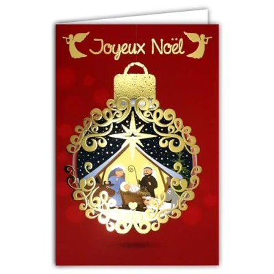 Glittering Gold Merry Christmas Card with White Envelope Size 12 x 17.5 cm Ball Illustration Nativity Scene Child Jesus Marie Joseph Sheep Donkey Ox Star Angels Made in France