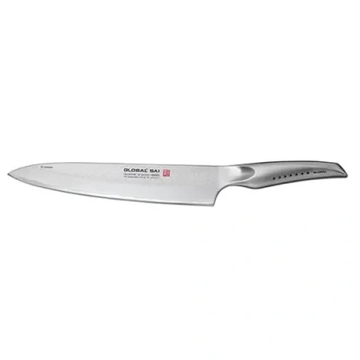 Harts of SturThis Global Sai cook's knife is constructed from cromova stainless steel with a 3ply hammered finish blade.The hollow weighted handle provides perfect balance with the 25cm blade and a firm but comfortable grip. Complete with a lifetime warranty and made in Japan.Designed by Komin Yamada, the creator and designer of the first Global knives. The Sai range is designed to reflect the changes in the world since the first creation of Global knives. The Sai collection, designed to professional level will enhance your cookery skills and preparation techniques. The handles are designed to be stylish and ergonomic with 7 dots along the handle instead of the usual pattern on the global handle, these dots represent the Japanese bushido way of the warrior and the 7 virtues of the Samurai.  Knives are not for sale to persons under the age of 18. - all knives and bladed products are delivered by Age Verified Delivery (AVD). The carrier may request proof of age in order to deliver your parcel. If proof of age is not available, or the recipient is underage, the carrier will refuse to deliver.