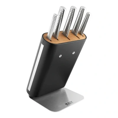 Keep your favourite cooking knives on hand at all times and in plain view whenever you need them with this beautiful Global Ukon 6 Piece Knife Block Set.Crafted from the finest quality Japanese stainless steel and hardwood, this knife block is as stylish as it is functional thanks to the modern, cutting-edge design and space for 5 knives.Within the set itself, you'll receive 5 of the bestselling Global knives that are perfect for everyday use and will help with a variety of cooking tasks, plus you get the practical knife block included to help you keep your knives tidy and save space in your drawers.This Global Ukon 6 Piece Knife Block Set can be easily cleaned using some warm water and a light detergent. Neither the block itself or any of the knives should be submerged in water or placed in the dishwasher.This Global Ukon 6 Piece Knife Block Set Contains, GU-01 20cm Chef’s Knife, the GU-03 22cm Bread Knife, the GUM-10 14cm Vegetable Knife, the GUS-22 15cm Scalloped Utility Knife and the GUF-30 9cm Paring Knife.
