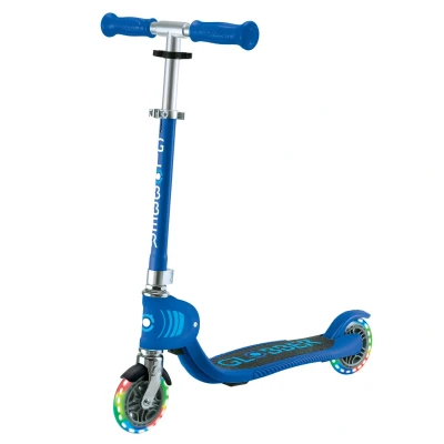 Globber Flow Junior Foldable Kids Kick Scooter Secure Ride for 3 5 Years Old, T bar, Battery free LED Wheels, 2 Anti slip Grip Year Warranty (Navy Blue)